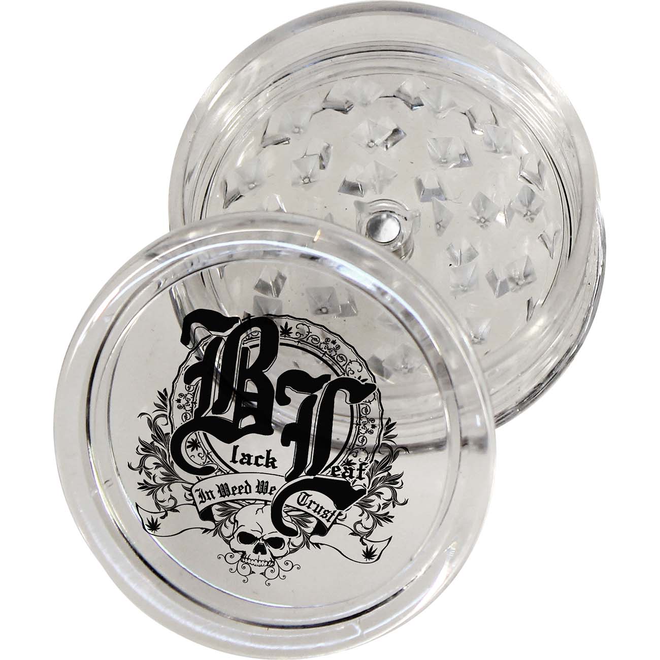 Black Leaf herb grinder made of acryl with pyramid teeth, magnetic lid and stash compartment.