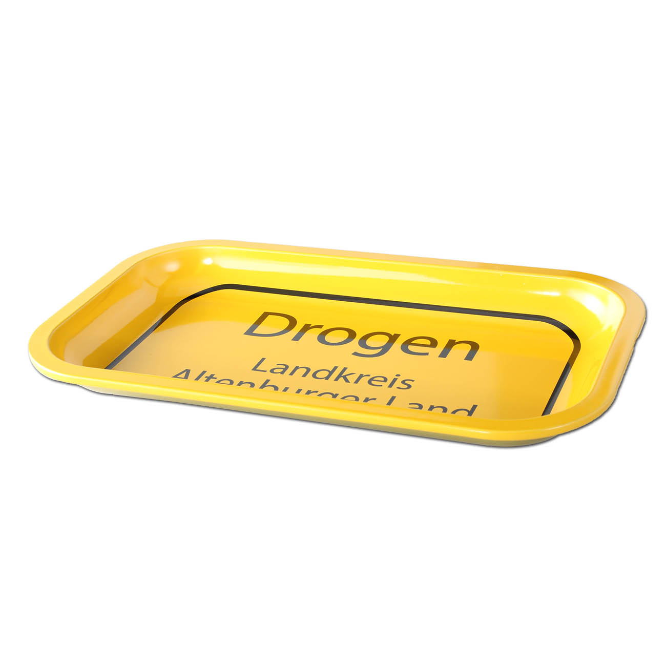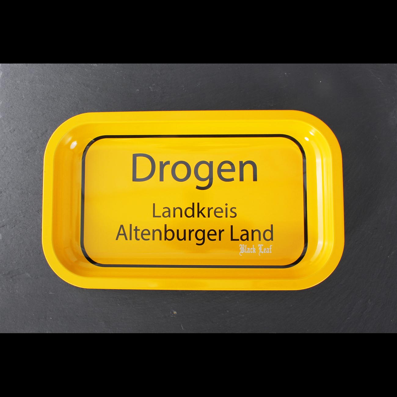 Funny rolling tray by Black Leaf® showing one of the most frequently stolen place-name signs in Germany: DROGEN (Drugs)! In the district of Altenburger Land district.