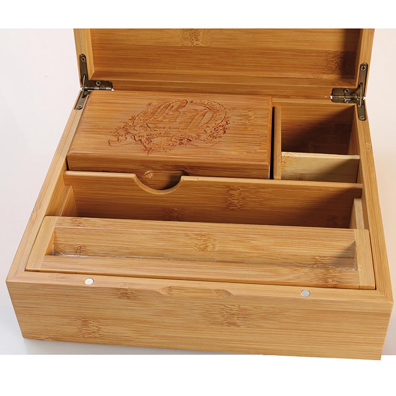 The Stoner Box II from 'Black Leaf' made of Bamboo with Skull design has everything the smoker's heart desires: papers holder, grinder compartment, removable rolling form, separate pollen box with screen and naturally plenty of storage space. The lids of the Stoner Box II and pollen box are closed magnetically. The pollen box is made up of 3 parts. The lid can also be used as rolling base, but the removable rolling form is top. The middle part of the pollen box has a screen through which the pollen can fall on the black acrylic plate.